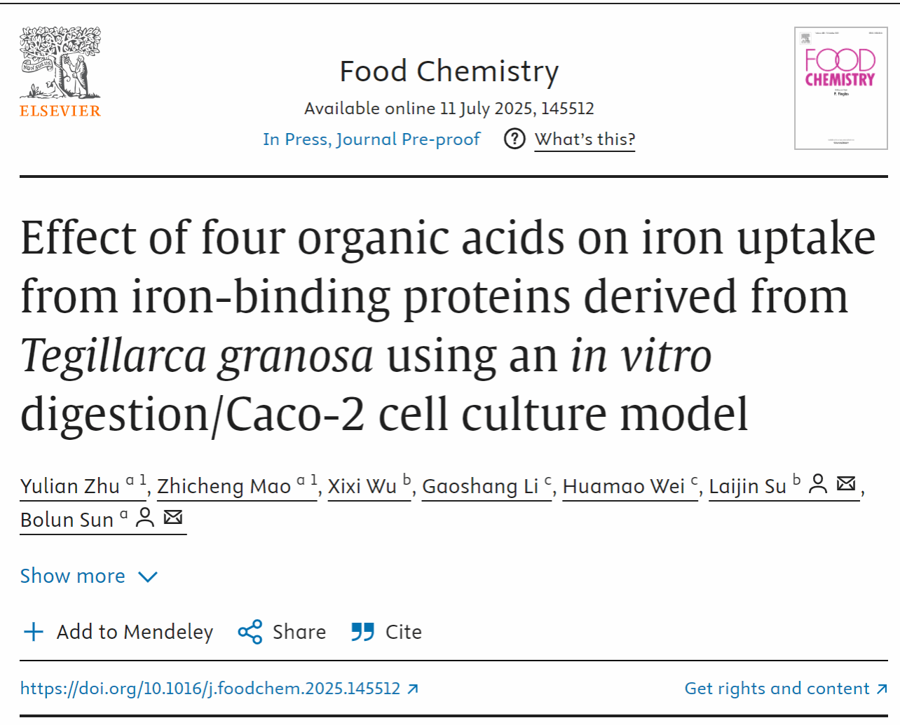 近日,快猫 护理学专业本科二年级两位学生朱育涟和毛志城分别以第一作者和共同第一作者身份在营养学国际顶刊Food Chemistry(中科院一区TOP,IF=9.8)发表论著“Effect of four organic acids on iron uptake from iron-binding proteins derived from Tegillarca granosa using an in vitro digestion/Caco-2 cell culture model”。该论著由快猫 近年来新引进的青年教师孙博伦博士指导。