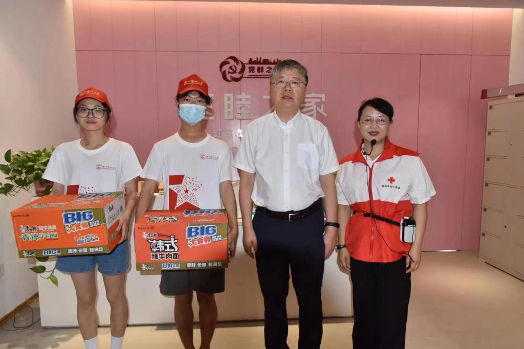 在医睦之家,李校堃校长与在座的“生命守护”实践团指导老师、实践团学生代表谈心谈话,并且为实践队的同学们带来了慰问品。