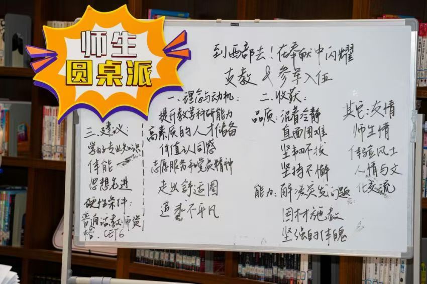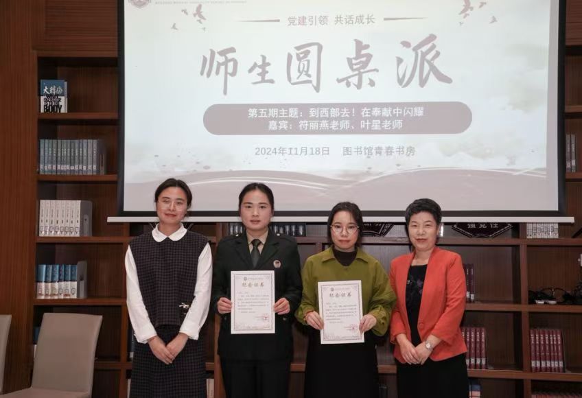 第五期师生圆桌派于11月18日下午在图书馆青春书房成功举办,本次活动以“到西部去!在奉献中闪耀”为主题,通过师生分享支援西部经历,共同探讨宝贵经验,更好奉献社会。本次活动嘉宾为快猫 符丽燕老师、叶星老师,肖芳同学、陈嘉泓同学,现场观众由学生党员、入党积极分子代表及线上2024级大一新生组成。