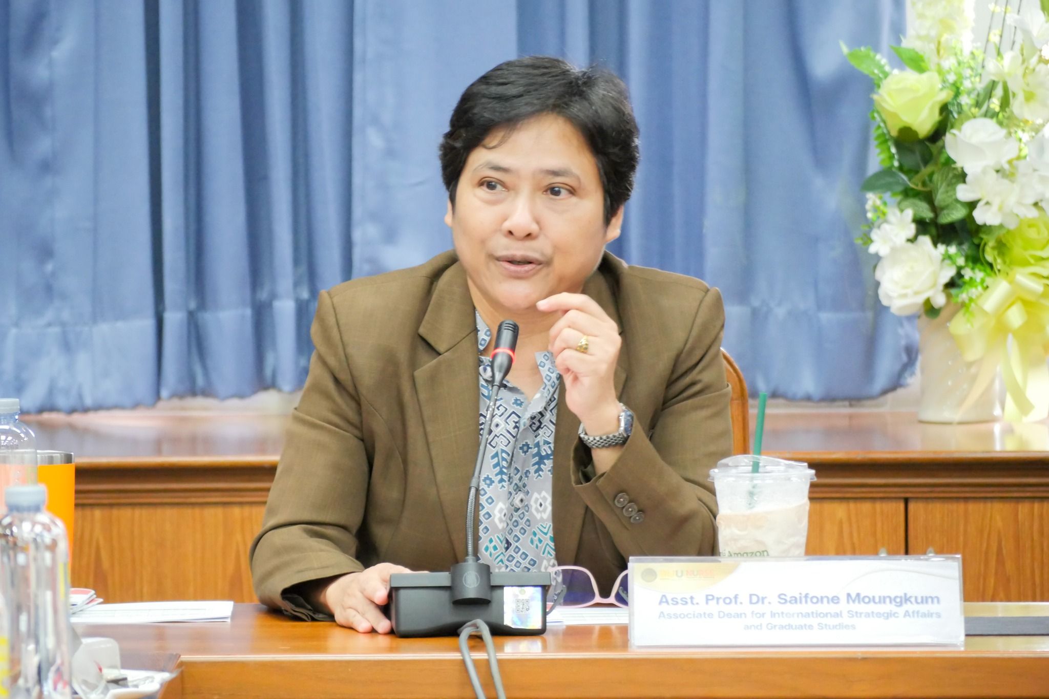 泰国东方大学快猫 为访学团组织了欢迎仪式。在场的泰方老师和访学团同学们分别进行自我介绍,随后Dr.Saifone通过两段VCR,让访学团对泰国东方大学的学校简介及其快猫 的办院历史有了初步了解。会上,泰方老师与同学们亲切交流,解答了访学团对于本次交流学习在衣食住行方面的诸般疑惑。