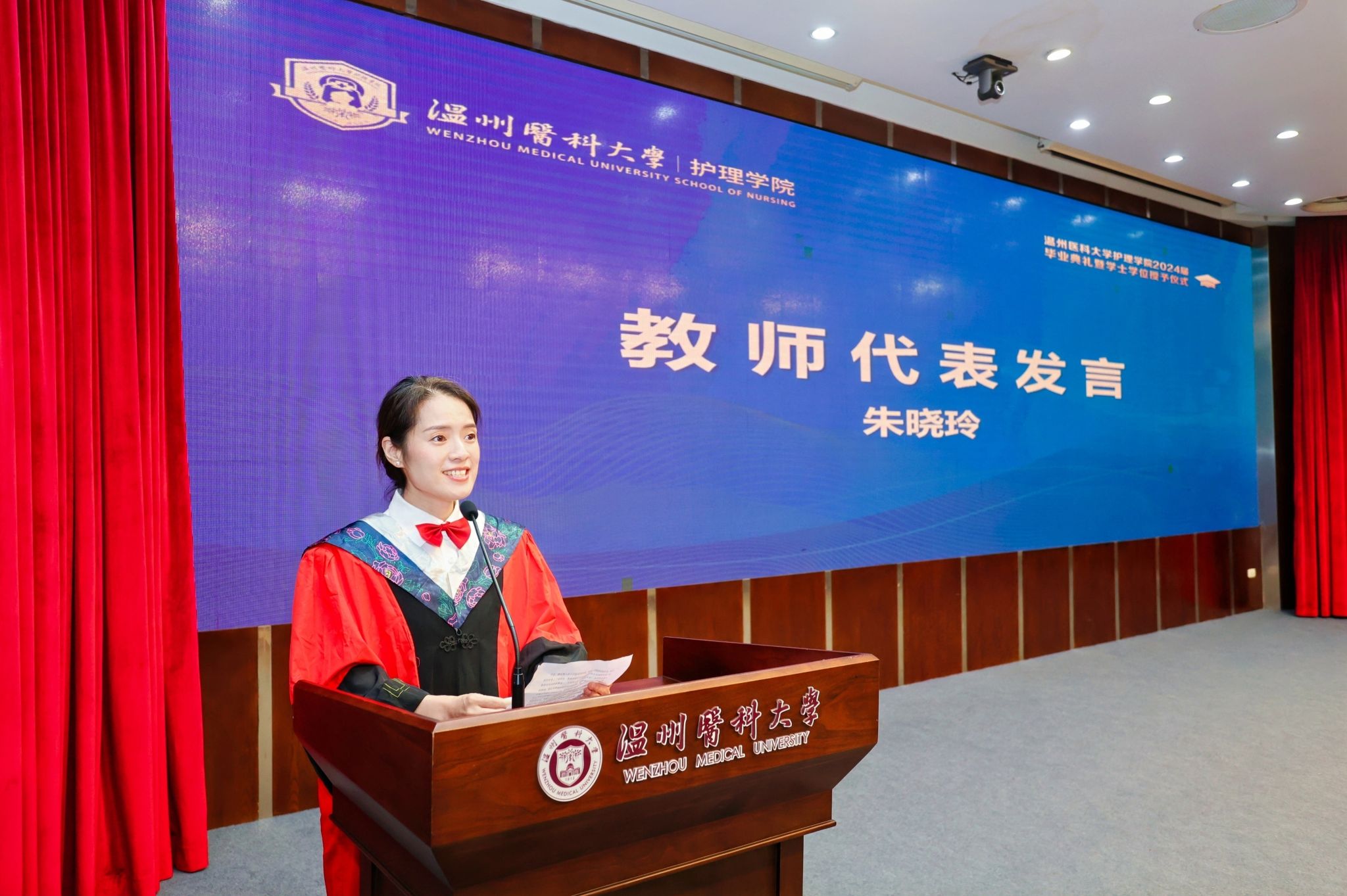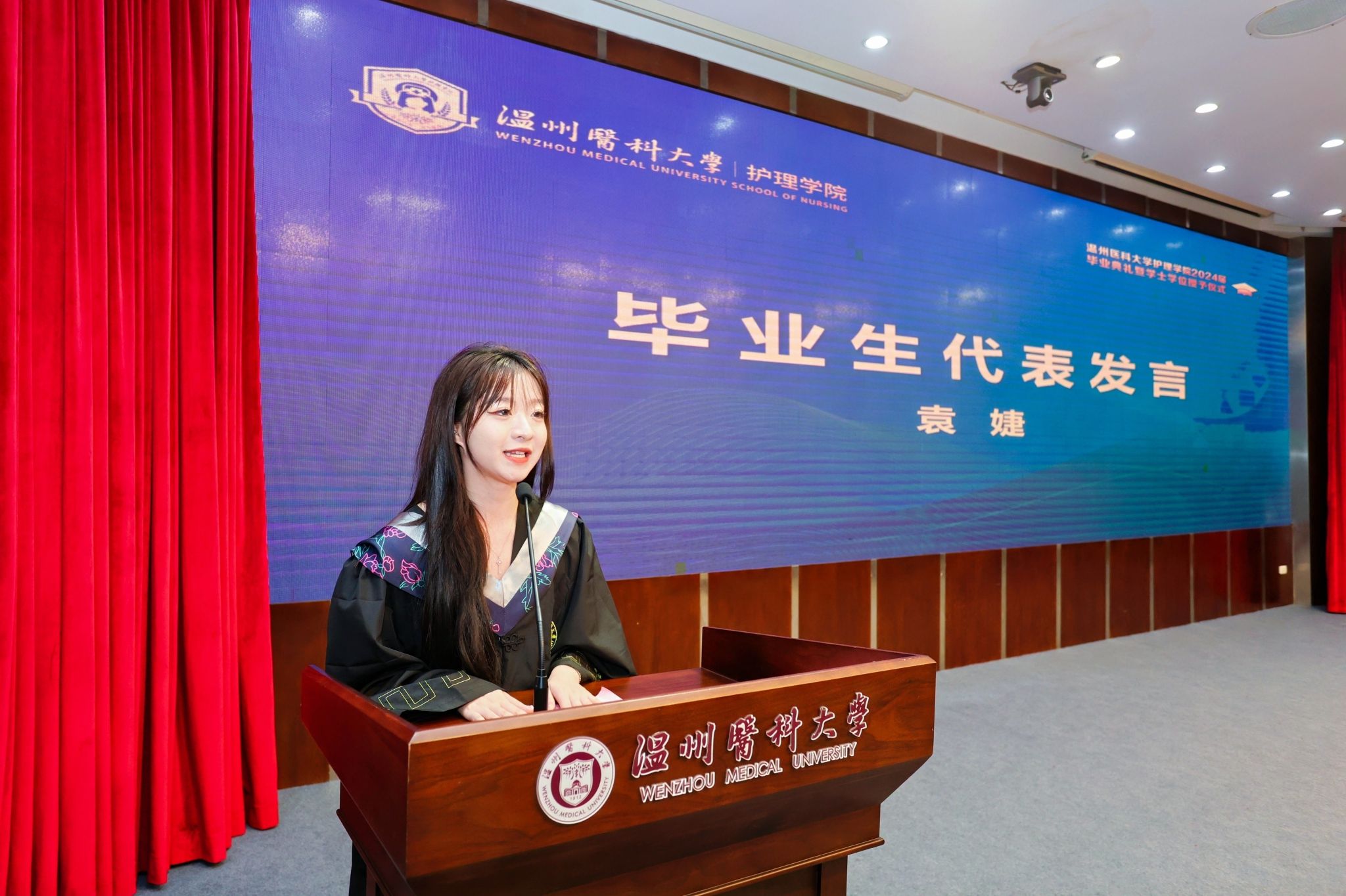 教师代表朱晓玲老师寄语同学们要不忘初心,将在校所学付诸实践,着力为患者解除伤痛,在护理道路上砥砺前行。毕业生代表袁婕回首在校求学点滴,表示今后将承载着老师们的殷殷嘱托,努力成为一名优秀的护理人。