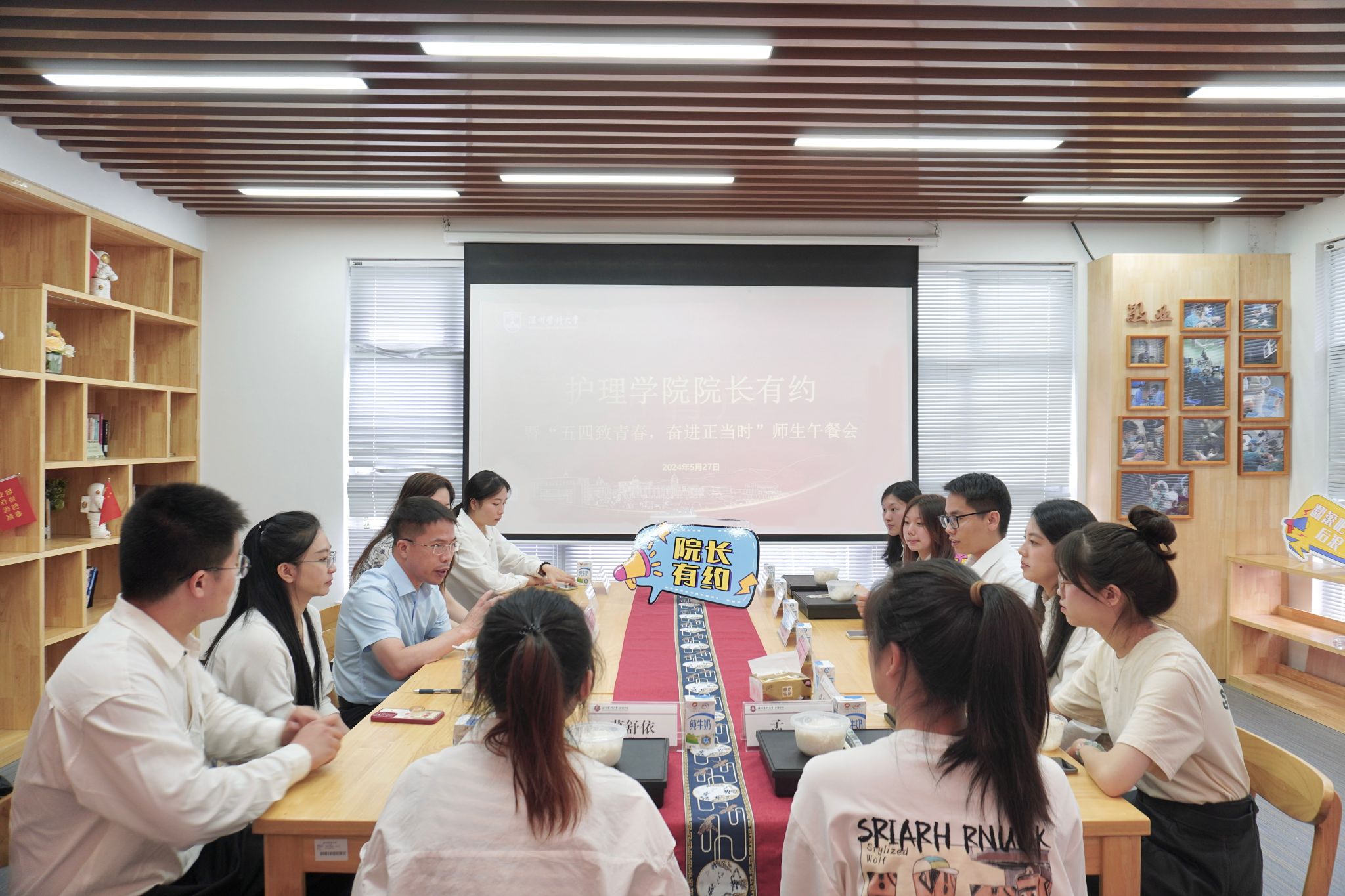 为深入落实立德树人根本任务,实施护理精英教育,发挥示范引领作用,着力培养面向中国式现代化的卓越护生队伍,5月27日中午,快猫 在我家书房举行院长有约暨“倾听‘生’音,卓越领航”师生午餐会。学院院长蔡福满、党委副书记金晓童、学工办主任张婧婧、辅导员李飞跃、王爽、李佳佳等与学院卓越护生代表倾心交流,共话成长!