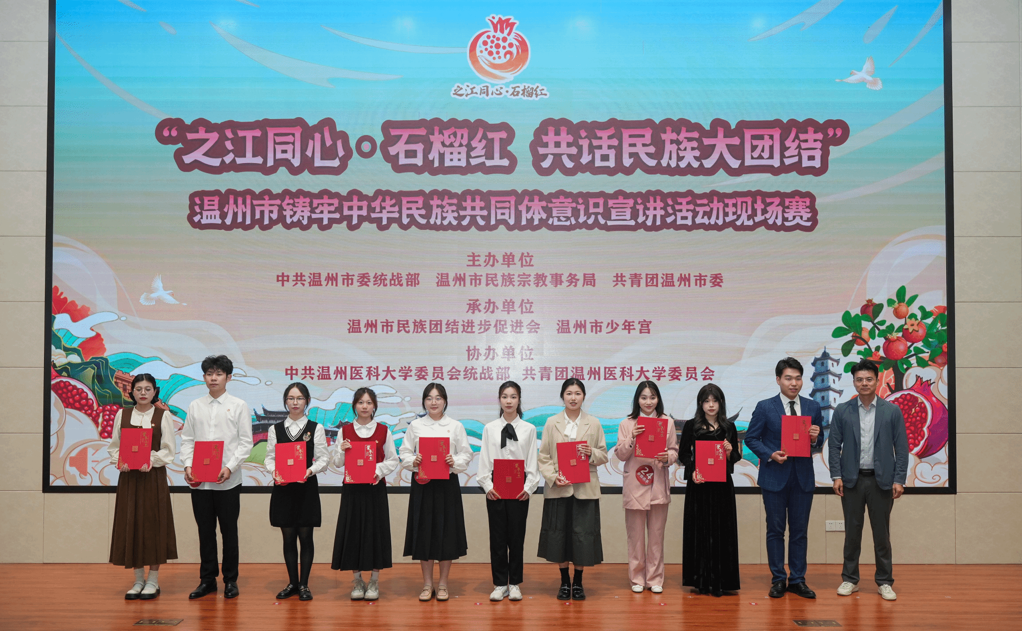为贯彻落实党的二十大精神,纪念“八八战略”实施20周年,在青少年群体中广泛开展铸牢中华民族共同体意识教育,2023年11月3日、4日,由中共温州市委统战部、温州市民族宗教事务局、共青团温州市委联合主办,温州市民族团结进步促进会、温州市少年宫联合承办的“之江同心·石榴红 共话民族大团结”温州市铸牢中华民族共同体意识宣讲活动现场赛在温州市少年宫和快猫 顺利举行。快猫 学子2023级护本3班黄王硕同学以《民族团结一家亲 坚定不移跟党走》荣获三等奖。