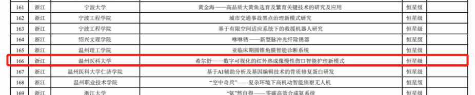 该项目团队在学院蔡福满、江小琼等老师的带领下,围绕慢性伤口开展从风险预警、愈合评估以及预后预测开展数智化、全流程的护理管理体系研究。目前该团队已获国家级大学生创新创业项目4项,省级创新创业项目2项,发明专利9项(1项以30万元转化),实用新型专利5项。在国际皮肤病学顶级期刊British Journal of Dermatology(IF:11.11)及中华护理杂志等国内外期刊上发表高质量学术论文近10篇,并入选中华护理杂志百篇优秀论文、浙江省专业学位研究生优秀实践成果和浙江省优秀专业型硕士学位论文,先后获国家级及省级大学生“互联网+”及“挑战杯”创新创业大赛金奖、一等奖等奖项近10项。