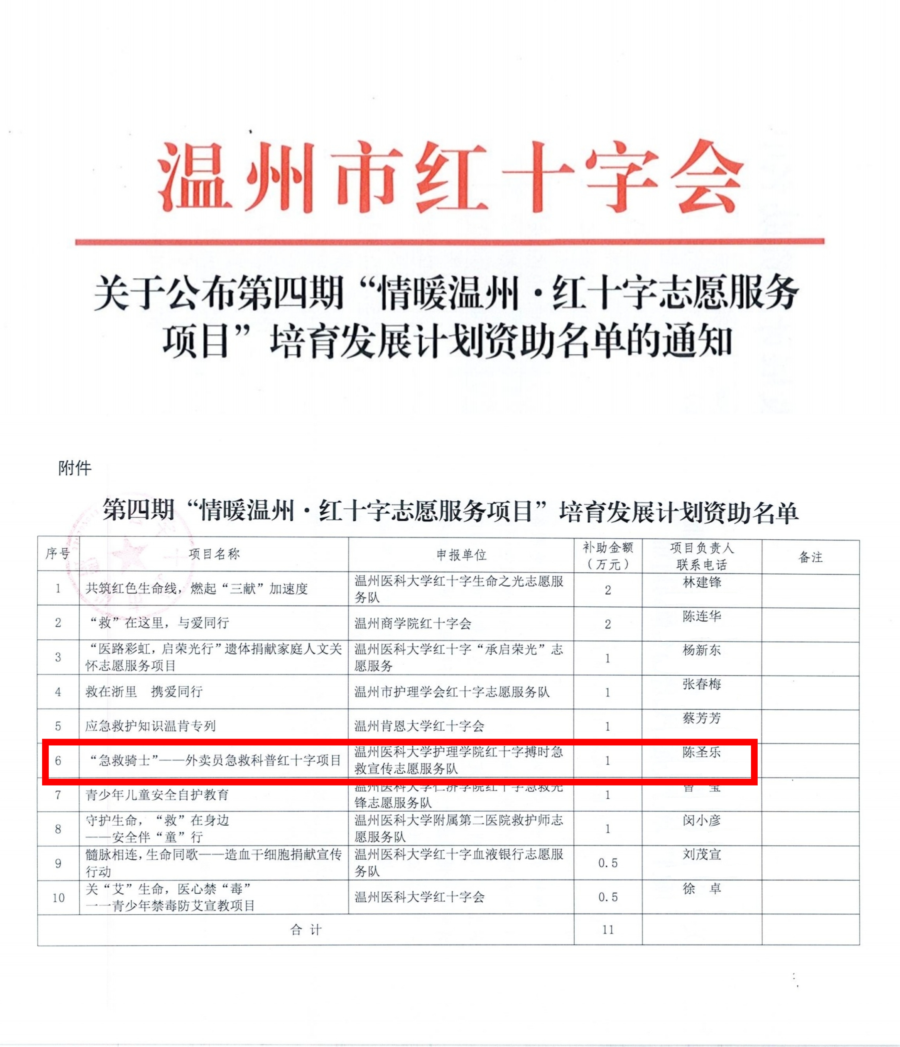 据悉,本次温州市红十字会第四期“情暖温州·红十字志愿服务项目”培育发展计划为进一步重点扶持、品牌打造,推进温州市红十字志愿服务项目提质扩面,面向全市高校进行项目申报,最终共遴选出10个项目。