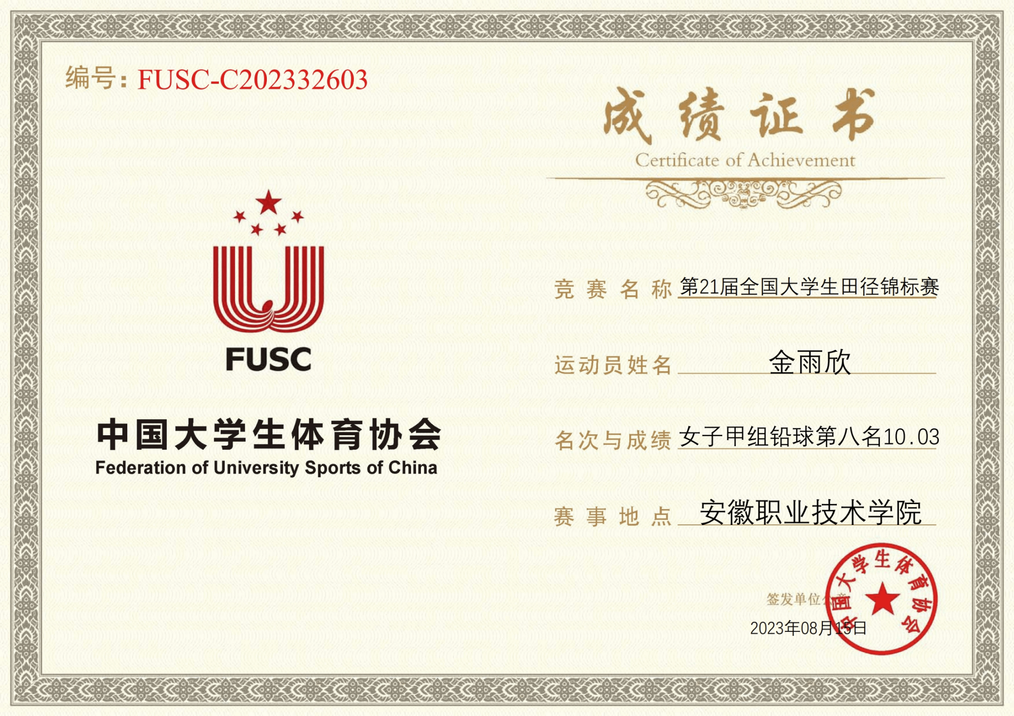 2023年8月10日—16日,快猫 健儿金雨欣同学(校田径队员)参加由中国大学生体育协会主办的第21届全国大学生田径锦标赛中,她顽强拼搏,最终以10.03米的成绩取得第八名,创造我校田径历史。全国田径锦标赛成绩是评价高校体育工作的一项重要指标。