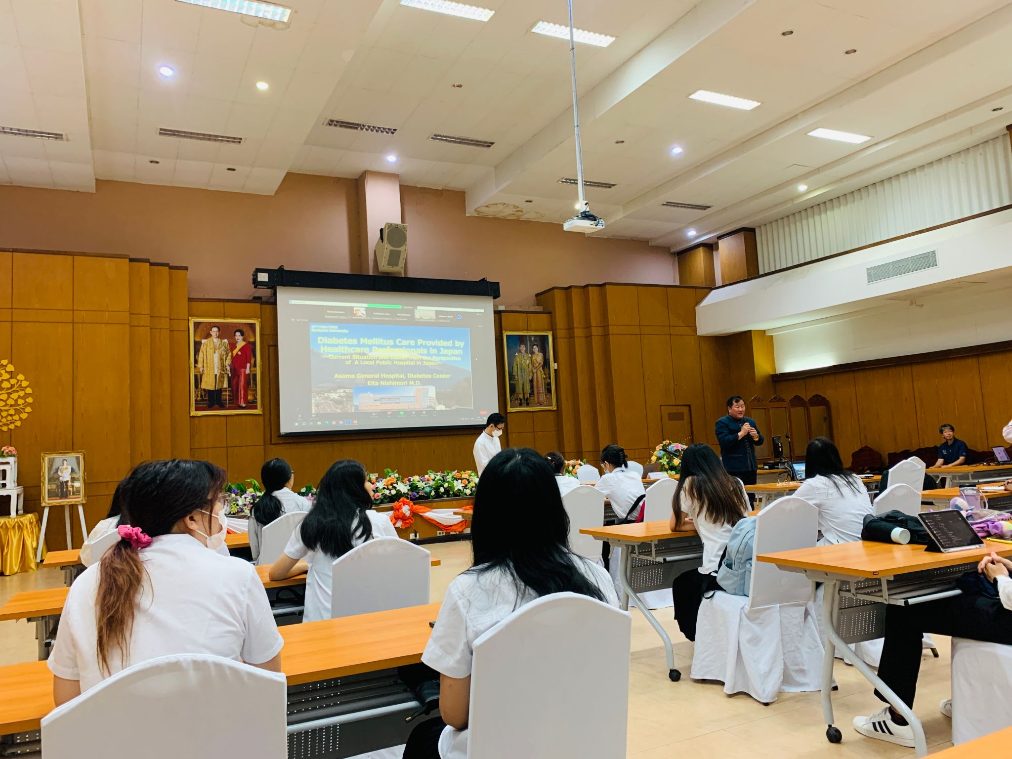 在第二轮的合作课堂上我们旁听了由日本教授Dr.Darussanee带来的关于糖尿病的护理现状及问题的讲座。教授从日本民众的生活现状切入,让我们对糖尿病的潜伏症状、并发症及患病人数逐渐增多背后的原因有了更清楚的认知。讲座现场,学术交流氛围浓厚,同学们也踊跃回答问题,积极分享。