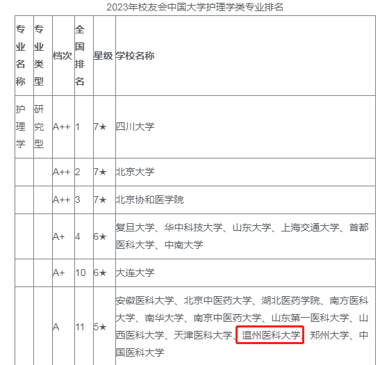 校友会中国大学一流专业排名是目前中国参评高校数量最多和参评专业规模最大的中国大学本科专业排名。该评价指标由学科水平、培养质量、师资水平、专业水平和专业影响等5大指标构成。在2023中国大学一流专业分档排名中,快猫 护理学专业获评2023中国五星级专业(5★),专业档次A,位列护理学专业(研究型)排行榜并列第11位,进入世界知名专业、中国一流专业行列。助产学专业获评2023中国三星级专业(3★),专业档次A+,位列助产学专业(研究型)排行榜并列第3位,跻身中国区域一流专业行列。