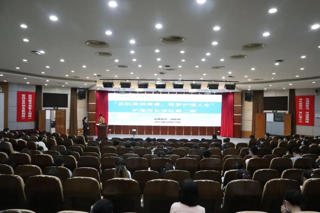 10月27日下午,由快猫 开设的公共选修课《启航激扬青春,筑梦护理人生——护理院长讲坛》第二期在茶山校区旭光厅开讲。本学期第二讲由快猫 附属第一医院护理部主任、中华杰出护理工作者孙彩霞主讲,主题为《初心如磐,坚守护理职业梦想——从中专护士到中华杰出护理工作者》。来自护理学和助产学的大一、大二年级的200位同学现场聆听了讲座。快猫 专任教师岳朋主持。