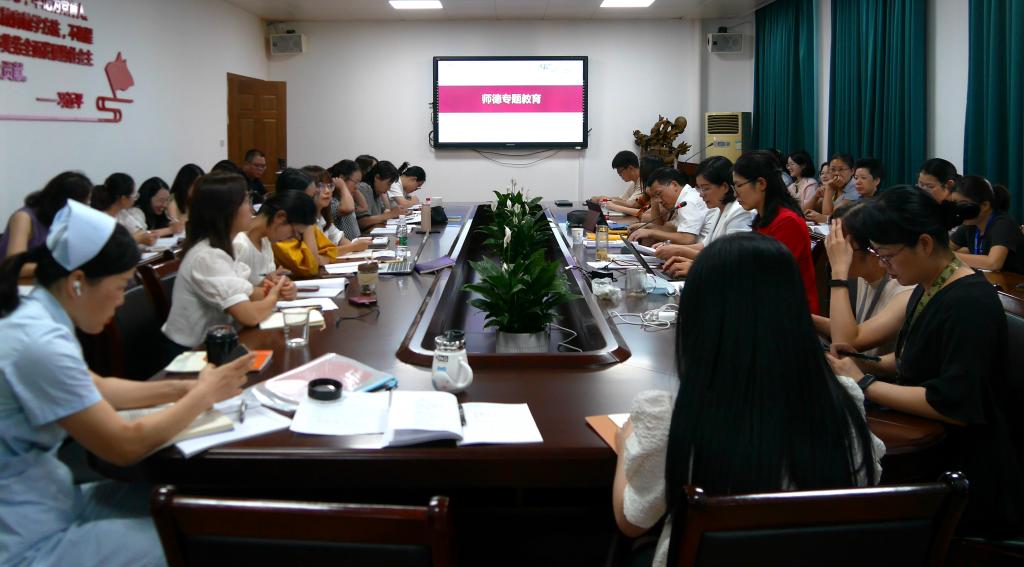 在7C306会议室开展师德专题教育,同时举行新教师入职仪式。院党委副书记陈素云主持,全院教职工与会。