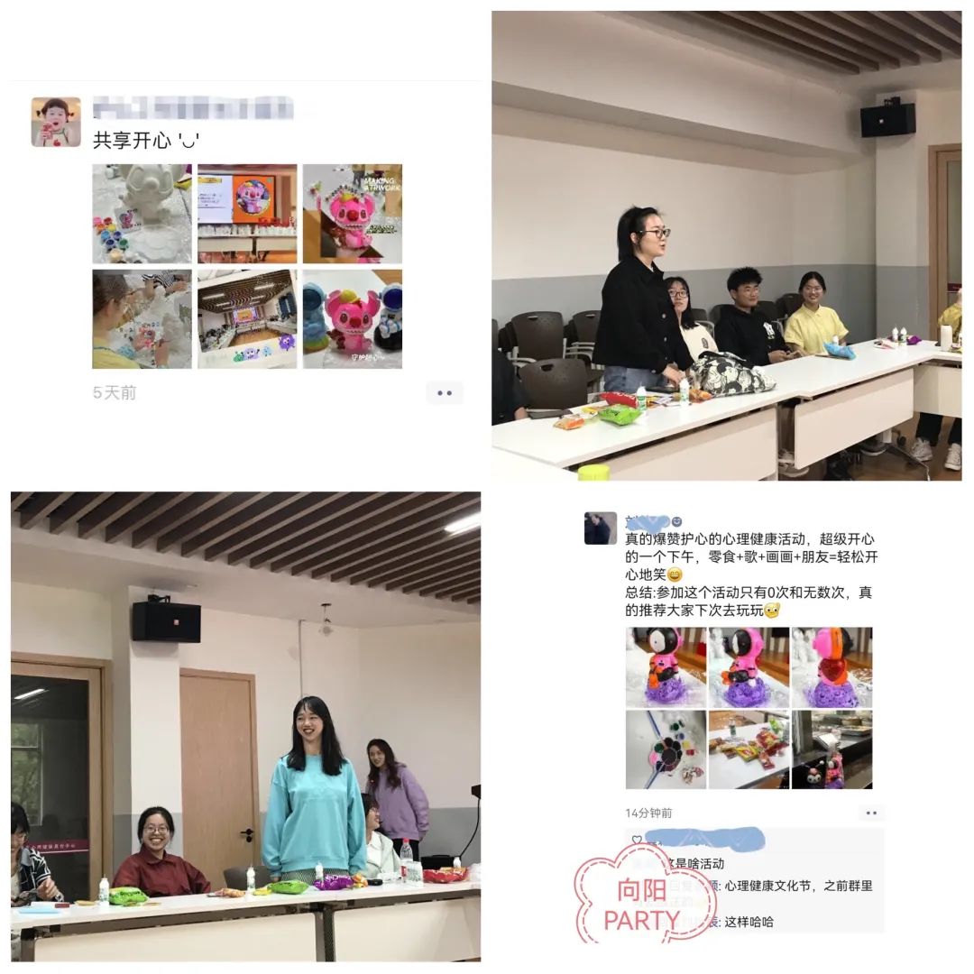 爱自己,做一个拥有幸福力的人,要从行动开始。为此,快猫 心理辅导站为同学们举办了向阳PARTY,让同学们在活动中感受幸福、创造幸福、传递幸福。“击鼓传花”小游戏快速地打破同学们之间陌生的隔阂,“听歌猜歌名”活动以轻松愉悦的旋律帮助同学们舒缓压力,“抖落便利贴”小运动让同学们笑声此起彼伏,“绘制石膏娃娃”沉浸式彩绘让同学们在新体验中感受生活中的幸福感……
