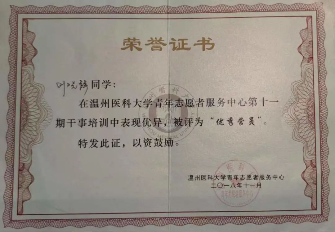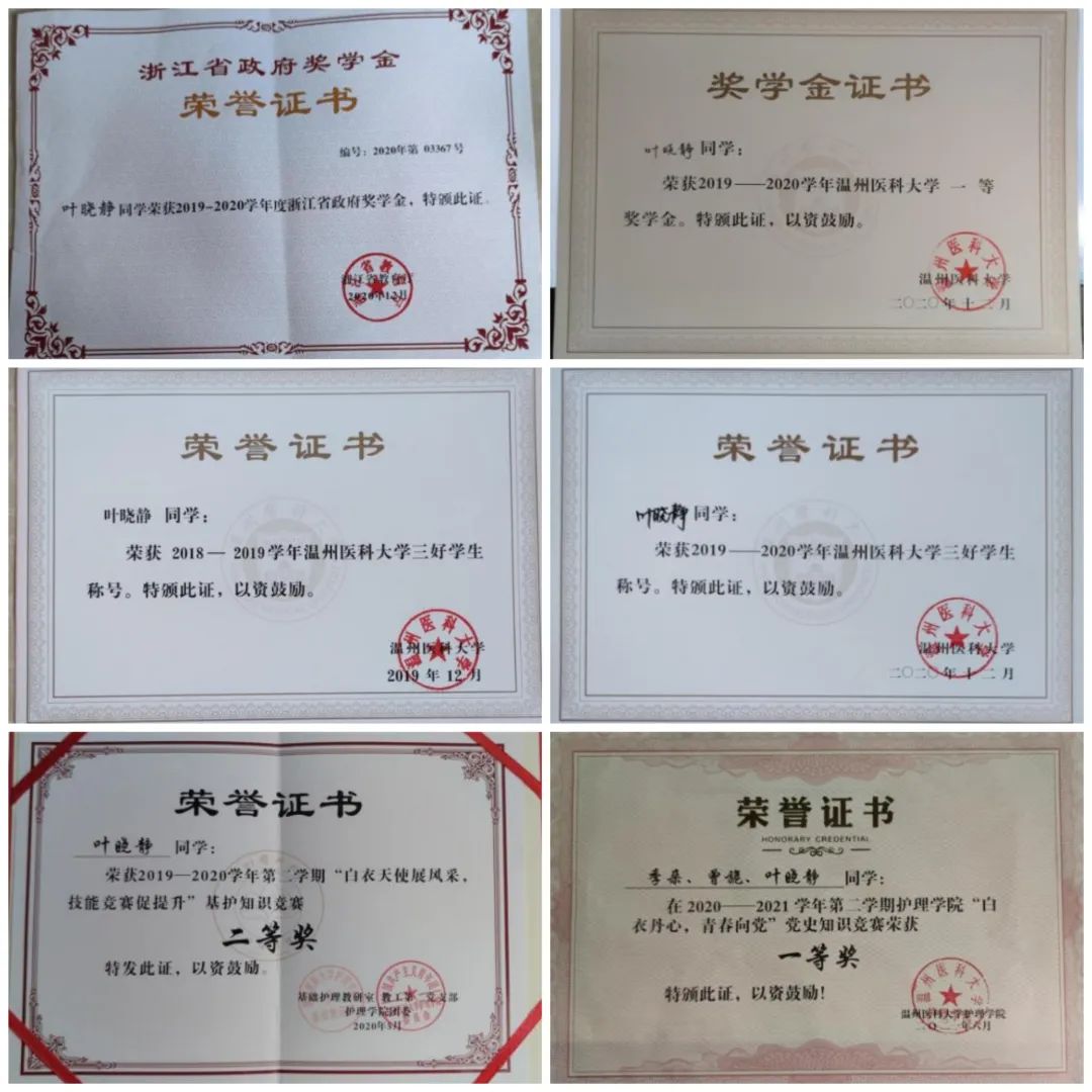 暑假期间叶晓静参与了快猫 杨晔琴老师的课题,虽然课题并没有给她带来荣誉,但她从中获益匪浅。“做科研的过程让我掌握了查阅文章、整理资料、协调沟通等技能”。同时,叶晓静介绍了她身边朋友的经历,参与课题往往能让自己发现未来想要从事工作的方向,激发自己发现问题的能力,探索事物存在的原因。在学习知识的同时叶晓静抓住空余时间参加了各类竞赛,全国大学生职业发展大赛校赛一等奖,校护理学科竞赛一等奖等都是她获得的荣誉。叶晓静鼓励学弟学妹们:“要趁早抓住机会,积极参加各项活动,竞赛可以让人开阔眼界,锻炼自己各项技能,认识更多优秀的人,也不用过于在意比赛的结果,因为付出就会有回报。”