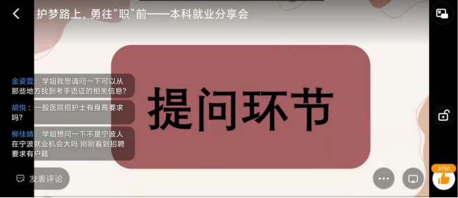 随着秋招临近,快猫 就业指导服务中心于11月26日,特举办了护理本科线上就业分享会,邀请了就业于宁波市第六医院的冯佳妮学姐以及就业于快猫 附属第一医院的赖叔意学姐,为同学们进行求职面试技能专场经验分享。