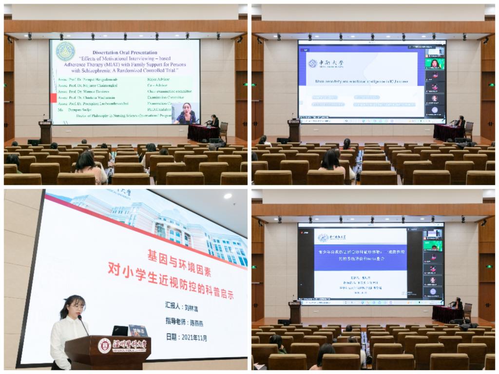 心理护理专场,泰国东方大学博士研究生PornpunSudjai分享了她基于动机访谈的依从性治疗与家庭支持对精神分裂症患者的影响研究,华中科技大学博士研究生张垠莹分享了其针对青少年自我伤害后急诊科就诊体验的质性研究,中南大学硕士研究生叶碧云分享了其针对重症监护护士的道德敏感性和情商的研究,快猫 硕士研究生刘林洁分享了其研究中发现的基因与环境对小学生近视防控的影响。