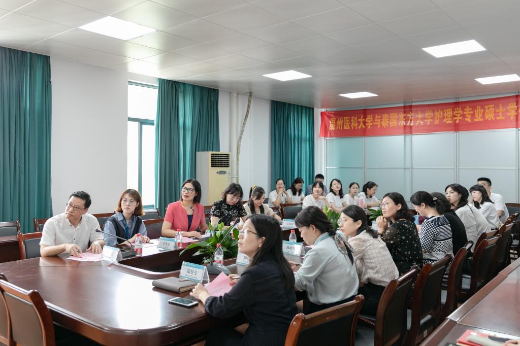 9月14日下午,快猫 与泰国东方大学合作举办的第三届护理学专业硕士学位教育项目开班典礼在快猫 7C306会议室举行。研究生院副院长郑曼曼、国际合作交流处副处长林歌吟受邀出席,快猫 党委书记李旭东、党委副书记周恩红、副院长张春梅、项目中方教师陈春、夏玲姿及相关科室人员现场参加,共有27名新生分别以线上、线下形式参加。泰国东方大学快猫 院长Pornchai Juallamate博士、泰方项目负责人Chintana Wacharasin博士、泰方教师在线参加,典礼由张春梅副院长主持。