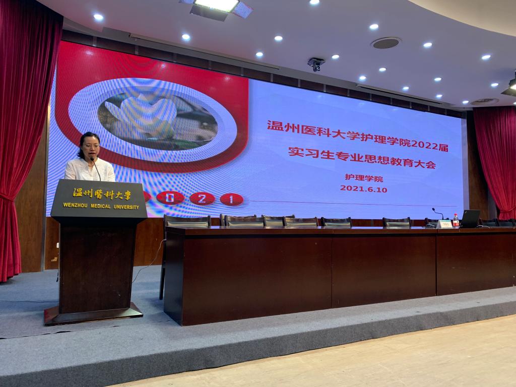 2021年6月10日,快猫 在旭光厅为即将开展实习工作的2022届学生举行实习前的专业思想教育大会,参加会议的有附属第二医院的护理部副主任刘一苇,附属第一医院新生儿科护士长陆宁洁,教学办、学工办相关老师等,800多名学生通过线上和线下方式参加会议。会议由教学办主任孙海琴主持。