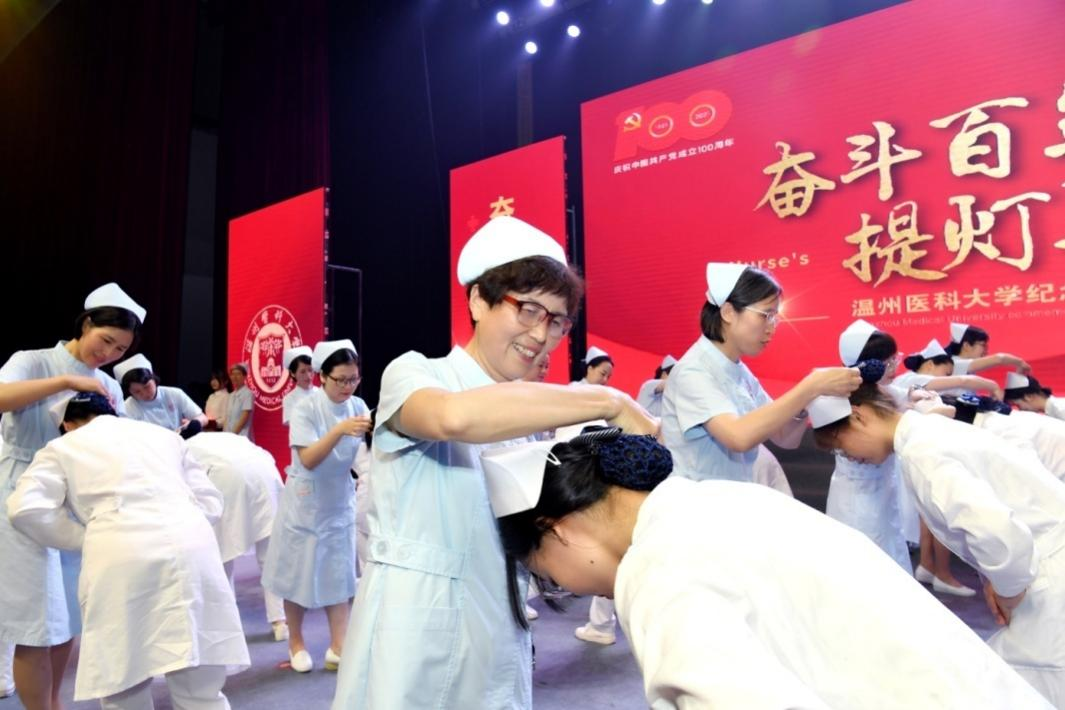 左转、鞠躬、入位、下蹲、授帽、起身……在舒缓的音乐中,877名护理专业学生有序依次上台、行礼,30名长期从事护理教学工作的专业教师和来自临床一线的护士一一为他们戴上了圣洁的燕尾帽和圆帽,2名老护理人为他们传递象征“燃烧自己,照亮别人”的蜡烛。现场,不少学生流下激动的泪水。