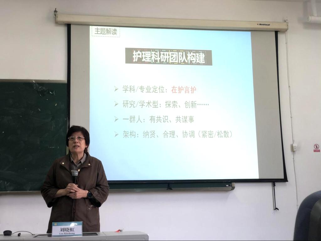 刘晓虹就“护理科研团队构建”作主题演讲,她提出,科研团队需要负责人的定力和主导性、团队的凝聚力和包容性、成员的合作性和承继性。她用实例讲解了一个科研团队如何从最初的学术探索,到借力快速提升、学术成果初见,到高水平研究增量、发布高品质成果,并建立学术机构的构建过程。同时,刘教授结合自身经历详细讲述一个科研团队在专业定位、选题、团队成员培养等方面的经验。