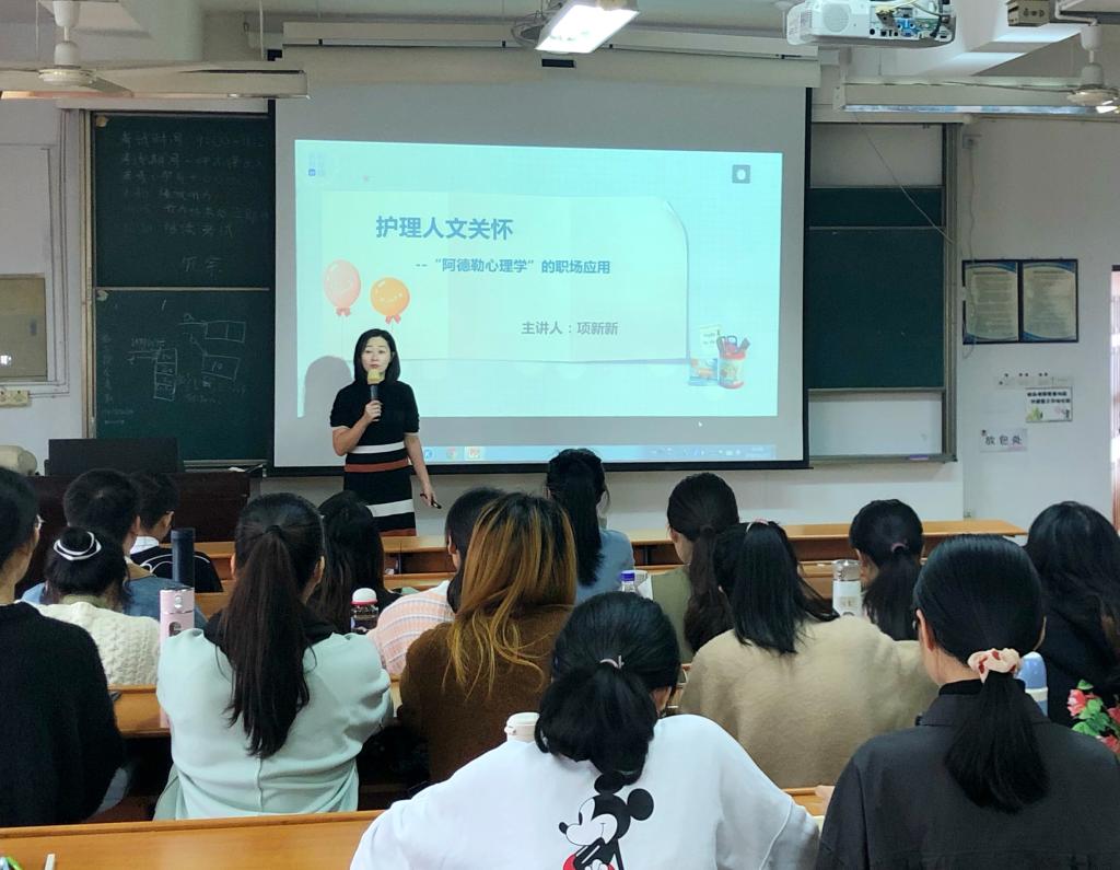 为了进一步缓解研究生学业和人际关系压力,促进研究生身心健康发展,提高研究生综合素质,11月27日下午,快猫 在7DJ406教室组织举办第十五期研究生沙龙。本次活动特别邀请国家二级心理咨询师、国际鼓励咨询师项新新老师作为主讲人,讲解护理人文关怀——“阿德勒心理学”在职场的应用,2020级全体研究生参与了此次活动。