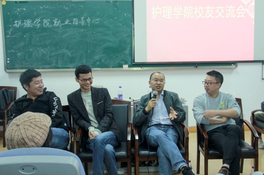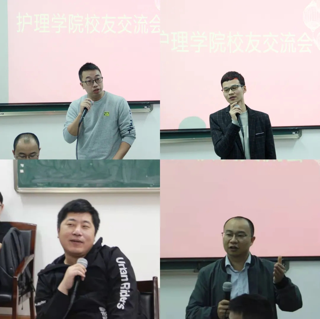 来自温州市鹿城区精神卫生办公室的校友陈德裕幽默地以在座四位校友的校内成绩排名与最初就业岗位的差异来说明本科阶段学业成绩对于未来选择权的重要影响,勉励大家要重视学习,同时他又向大家介绍了自己从附一医的临聘护士岗位考入鹿城区精神病医院正式员工,再转调鹿城区精神卫生办公室,从事精神卫生疾病防控管理的职业历程,强调了在本职岗位上不断树立目标、追求卓越的重要性。来自快猫 附属第一医院心脏监护室的校友李文玉向同学们分享了他之前参加汶川地震、温州动车事件、新冠病毒防控等重大事故中的重症救治工作经历,用自己的亲身经历告诉同学们男生在从事护理工作方面确实是有优势的,尤其适合急诊、手术室等对身体和心理素质都要求比较高的工作岗位,他也底气十足地表示他总是会被安排照护最重症的病人以及各种VIP病人,而这份底气就是源自于对专业技术的自信。东阳市人民医院义乌院区ICU的护士长金时校友则呈现给同学们一份满满的护理情怀,他表示当年自己填高考志愿时所有的志愿都填了护理学专业,随着时间的流逝,他对护理职业的热爱与日俱增。他认为努力和进取心是一个人成长的关键,他告诉同学们不要怕吃苦,他认为自己职业生涯中最难忘的是工作之初参加休息日留院三小时的志愿服务活动,让他得以参与大量急危重症病人的救治,学习到了大量正常班内难以掌握的知识和技术。来自温岭市肿瘤医院手术室的校友郑小球为大家讲述了从对护理职业的“无知”到“无所谓”再到“接受”“热爱”的心路历程。他认为护生在本科阶段提升综合素质是很有必要的,良好的沟通、社交能力和情商培养将有助于护生未来的职业发展。