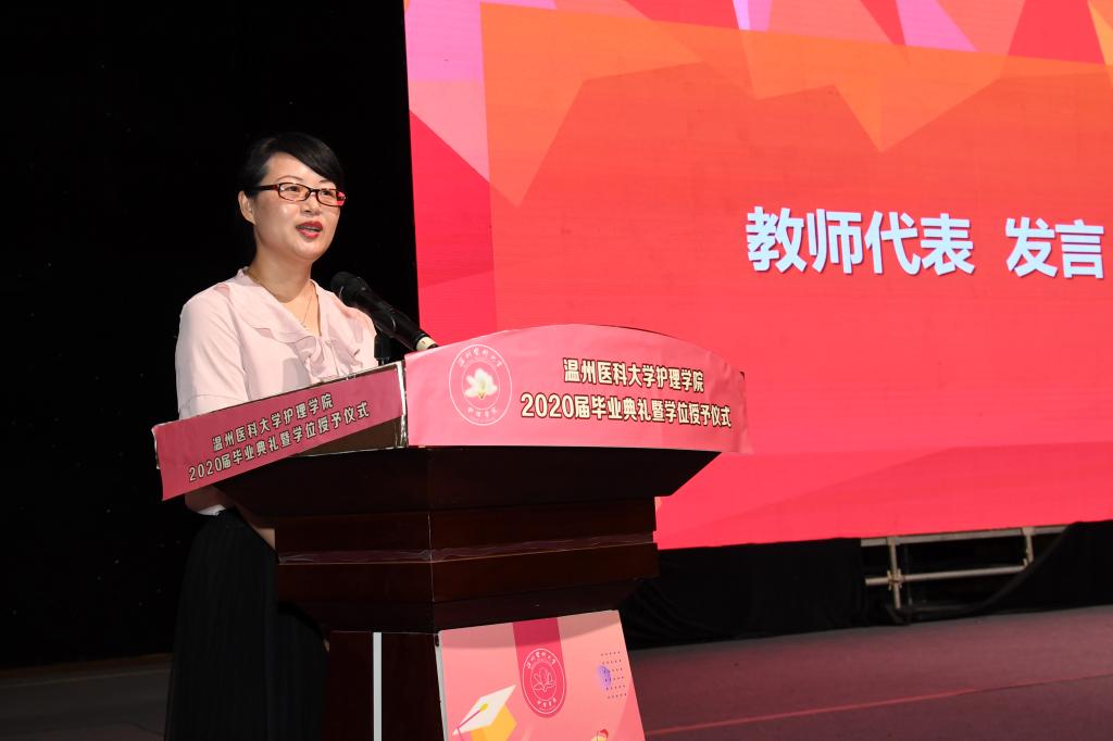教师代表吴永琴希望毕业生们不忘初心、强健体魄、善于沟通、守时诚信,希望同学们成为眼中有光、胸中有志、腹中有才、心中有爱的健康守护神,做一名有温度的温医大护理人!毕业生代表严梦燕表达了对母校的不舍和对老师的诚挚感谢,表示要将所学知识和技能服务社会、报效祖国。