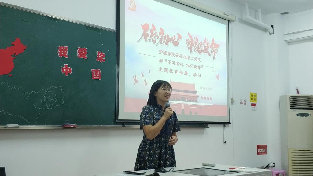 会上,王茹新老师带领大家再次学习了习近平在“不忘初心、牢记使命”主题教育工作会议上的讲话精神、省委书记车俊在全省“不忘初心、牢记使命”主题教育工作会议上的讲话精神以及吕帆书记在全校“不忘初心、牢记使命”主题工作会议上的讲话精神。习近平总书记提出主题教育的总要求是“守初心、担使命,找差距、抓落实”,主题教育的具体目标是“理论学习有收获、思想政治受洗礼、干事创业敢担当、为民服务解难题、清正廉洁作表率”。此外,王茹新老师还与大家分享了自己参加完学校组织的支部书记轮训班之后的学习心得和体会。王茹新老师提出,每位党员和入党积极分子要在心中埋下一个问号“我的初心是什么?”,在未来的学习生活中要时常反思,守住护理初心,担起时代使命。最后,参会党员和预备党员一起带着自己的那份初心重温入党誓词,时刻提醒自己要做一名合格的共产党员。