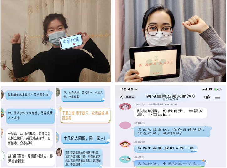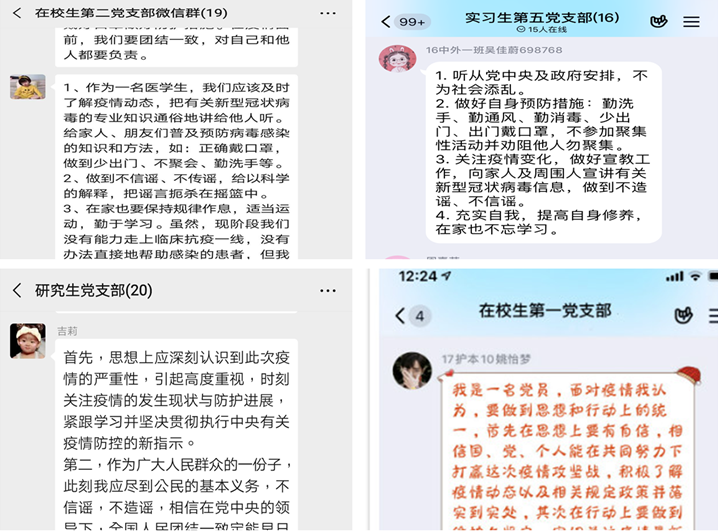 “作为未来医务人员,我们要肩负起使命与责任,做科学的传播者,谣言的粉碎者,健康的守护者,家庭的关爱者。”“面对疫情,我们要做到不恐慌、不造谣,时刻关注官方疫情消息;作为党员,我们更是要响应党和国家号召,积极配合、冲锋在前。”“作为班长和实习组长,每天关心班内和组内同学的身体情况,每天准时上报给学校和医院,做好联系工作。作为晚辈,积极向家中长辈宣传病毒相关知识和预防方法。”在线上的打讨论中,各支部学生党员们纷纷表示。