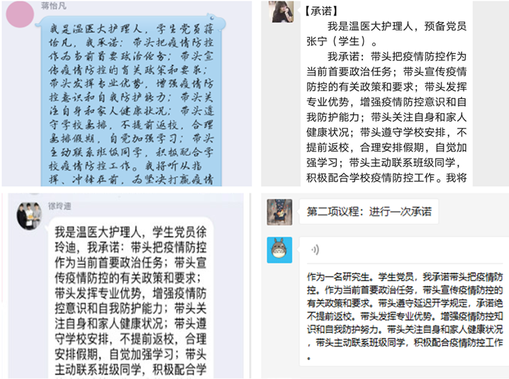 “我承诺:带头把疫情防控作为当前首要政治任务;带头宣传疫情防控的相关政策和要求;带头遵守延迟开学的规定,绝不提前返校;带头发挥专业优势,增强疫情防控意识和自我防护能力;带头关注自身和家人健康状况;带头主动联系班级同学,积极配合疫情防控工作。”各支部学生党员们在许下承诺时郑重其事。