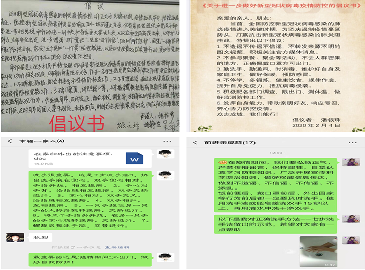 线下,各支部党员利用自己的专业知识,教授家人“七步洗手法”、正确鉴别口罩类型、正确佩戴口罩方法。利用网络资源,带领家人主动学习包含认识疾病、预防疾病、发现疾病、治疗疾病等内容的新型冠状病毒相关知识。党员们手写倡议书,通过亲友群、家庭群发起倡议,主动带领家庭成员响应相关防疫政策的落实。