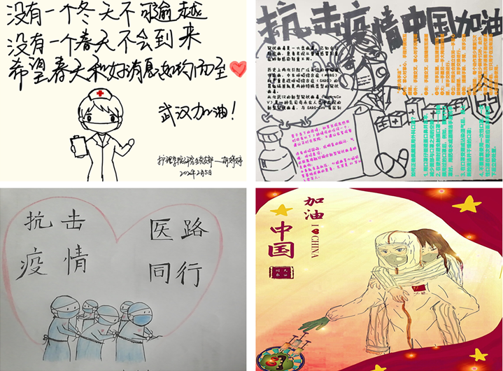 各支部学生党员们还用自己手中的笔,写下和画下为打赢抗击新型冠状肺炎阻击战一句想说的话。在学生第一党支部党员叶峰妙同志家中,看到叶峰妙在书写加油语,73岁的外婆更是主动要求写下一句“中国加油!”。学生第二党支部预备党员李欢利用自己的绘画技术,通过绘画为武汉加油、为祖国祈福。