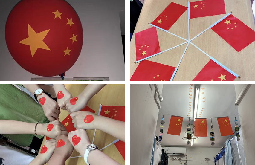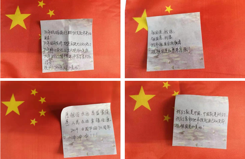 “愿祖国永远昌盛富强,愿人民永远幸福安康!”“中国就是我们,我们就是中国,我们与祖国血肉相连,愿祖国越来越好!”学生们写下对祖国母亲的生日祝福,和老师一起唱响《我和我的祖国》《我爱你中国》等歌曲,表达爱国情感。她们还在脸颊上、手背上贴起了小国旗贴纸,在寝室内外悬挂小国旗,营造浓郁的爱国氛围。