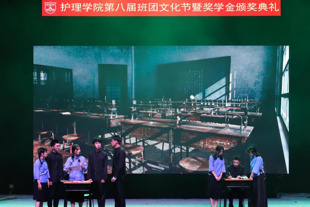 19护专4班用一幕《黎明之前》,重现了中国共产党如何在黎明下诞生;学院模礼队带来《中国年代秀》,展示了从先秦唐宋到晚清民国的服饰变化;19护专1班的话剧《我愿做护士》表达了护生们对护理职业的敬畏,对护理初心的坚守,对救死扶伤使命的牢记。