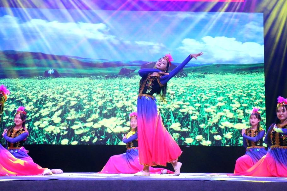 学院艺术团民舞队带来的舞蹈《绽放》中,维吾尔族姑娘们用优美的舞姿表达着对美的追求和对生命的热爱。