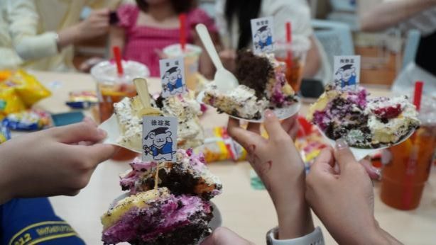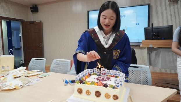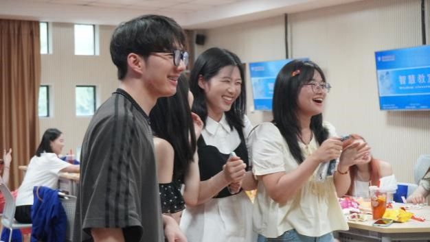 联欢会现场气氛轻松欢快,研究生会的同学们精心策划了多个互动环节。在温馨的切蛋糕仪式上,辅导员王国超和班长傅莹洁为毕业生们点亮蜡烛,分发纪念蛋糕,香甜的奶油传递着同窗情谊。随后的游戏环节热闹非凡,“谁是贪吃鬼”“传声筒”等趣味游戏让现场笑声不断,同学们在互动中展现出十足的默契。