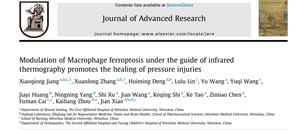 近日,快猫 慢性伤口护理研究中心骨干成员江小琼在国际权威期刊《Journal of Advanced Research》(IF=11.4,综合性一区TOP)在线发表题为“Modulation of Macrophage Ferroptosis under the Guide of Infrared Thermography Promotes the Healing of Pressure Injuries”的论著。该研究揭示了压力性损伤修复过程中温度动态变化的新机制,并基于此提出一种可临床转化及居家应用的护理干预策略,为压力性损伤的精准护理干预提供了新范式。