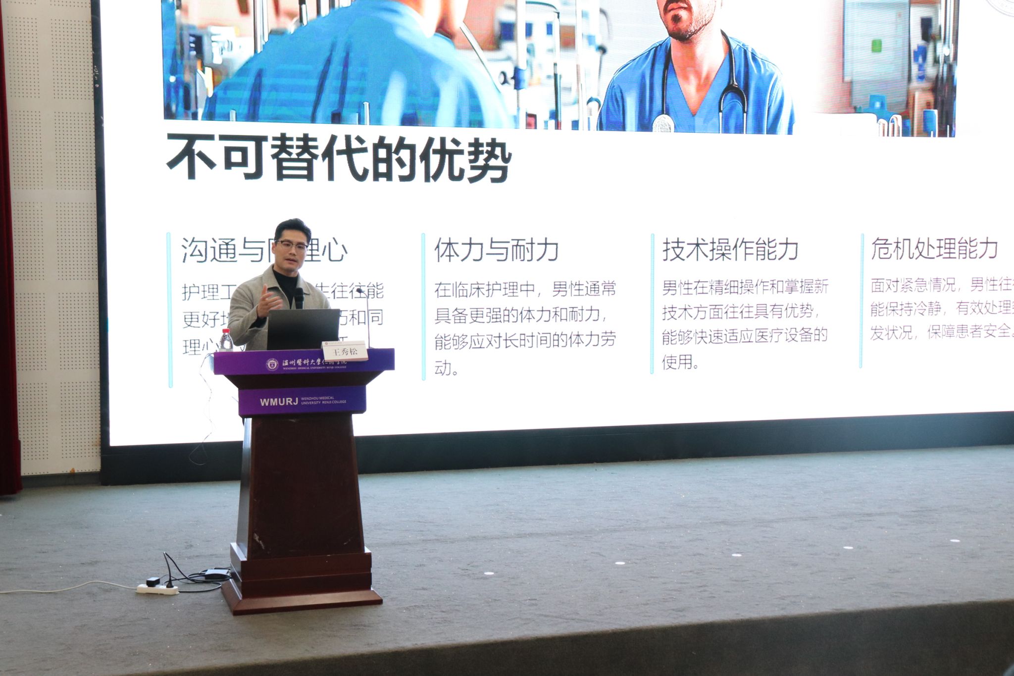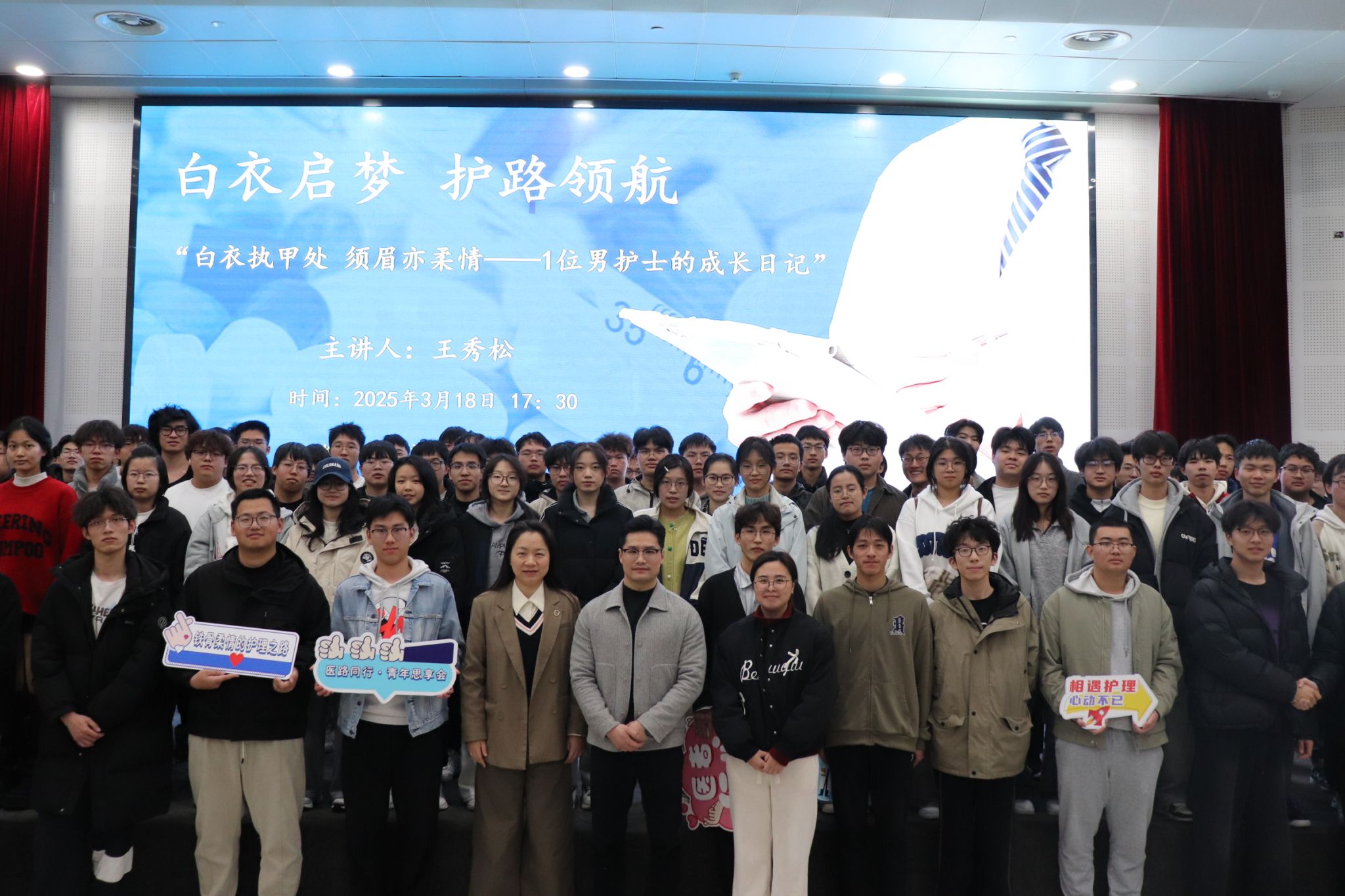 白衣执甲显担当,刚柔并济绽芳华。为助力我校护理学子明确职业发展方向,科学规划职业生涯,3月18日晚,快猫 于滨海校区仁心厅举办“白衣执甲处,须眉亦柔情—1位男护士的成长日记”主题讲座,学院党委副书记、纪委书记金晓童老师,24级辅导员出席活动。本次分享会邀请了快猫 附属第一医院急诊科副护士长王秀松老师,和同学们分享他的护理生涯成长轨迹。
