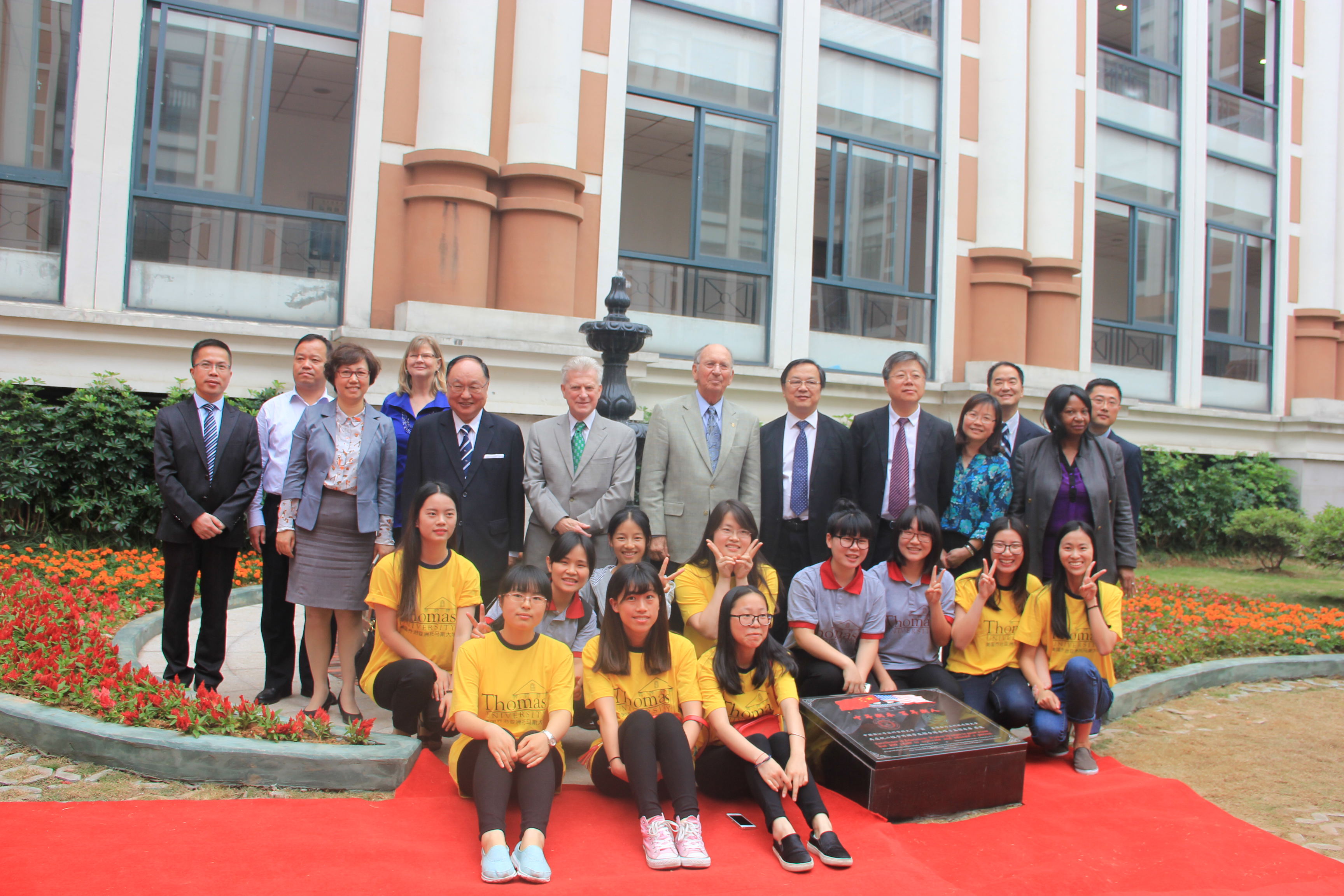 2015年5月21日,美国乔治亚州托马斯大学校董会主席约翰·格伦先生、校长盖瑞·邦威廉博士、校长资深顾问黄天中博士及中国总校区校长黄磊康博士等一行来访温医大,并于下午4点在同仁楼举行捐赠友谊喷泉落成仪式,我校瞿佳校长、李校堃副校长,以及快猫 党委陈行汉书记、姜丽萍院长、蔡福满副院长等出席本次仪式。
