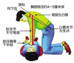第五步:胸外心脏按压:心脏按压部位——胸骨下半部,胸部正中央,两乳头连线中点。双肩前倾在患者胸部正上方,腰挺直,以臀部为轴,用整个上半身的重量垂直下压,双手掌根重叠,手指互扣翘起,以掌根按压,手臂要挺直,胳膊肘不能打弯。一般来说,心脏按压与人工呼吸比例为30:2。