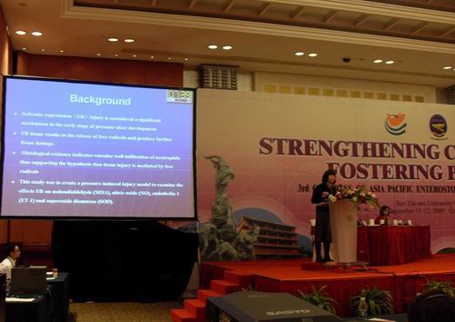 2009年12月11日——12日快猫 姜丽萍院长、学院教师及研究生一行四人赴广州参加第三届亚太地区造口治疗师协会学术会议,大会共有来自亚太地区及美国等多国代表共500余人参加。姜院长作为国内第5个造口治疗师学校校长应邀作为大会的主席团成员。此次会议共收录快猫 4篇学术论文做大会交流,其中姜丽萍院长的论文“Ischmia-reperfusion injury on early stage of pressure ulcer: a skin model in rats”做大会专题演讲。