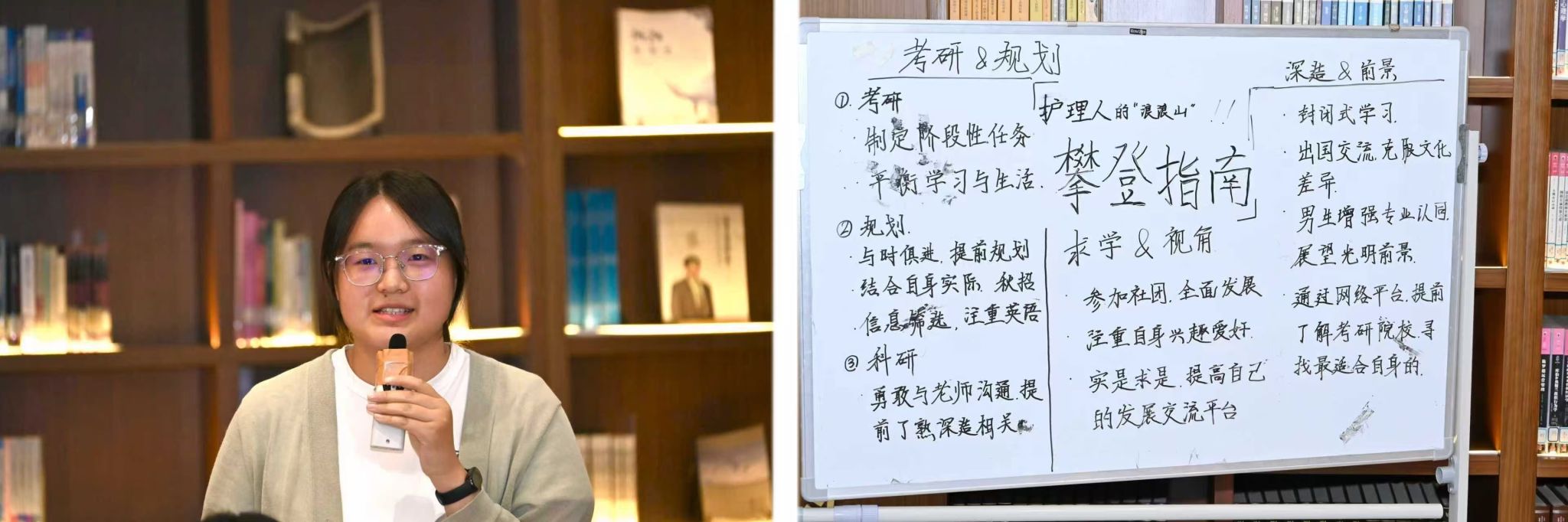 新学期伊始,同学们又步入了护理学专业学习的一个新阶段,随着对专业知识的学习掌握更加深入,进入临床工作的步伐也紧跟而来,大家迫切地想知道如何能规划好大学时光,不断提升自身能力以更好奉献社会。研究生李木子学姐将“考研”称作一种“战略性投资”,她分享道,拓宽职业选择权、在护理行业实现价值是她选择继续攻读硕士研究生的主要原因。在考研的过程中,她指出可以从“内驱力、个人规划、身心健康、接纳自我”四个维度去制定考研进程、顺利达成目标。李木子学姐回答同学们提问的关于规划问题时,她指出我们要提前规划、与时俱进,充分利用现有的资源和条件,提升自己的信息筛选能力。