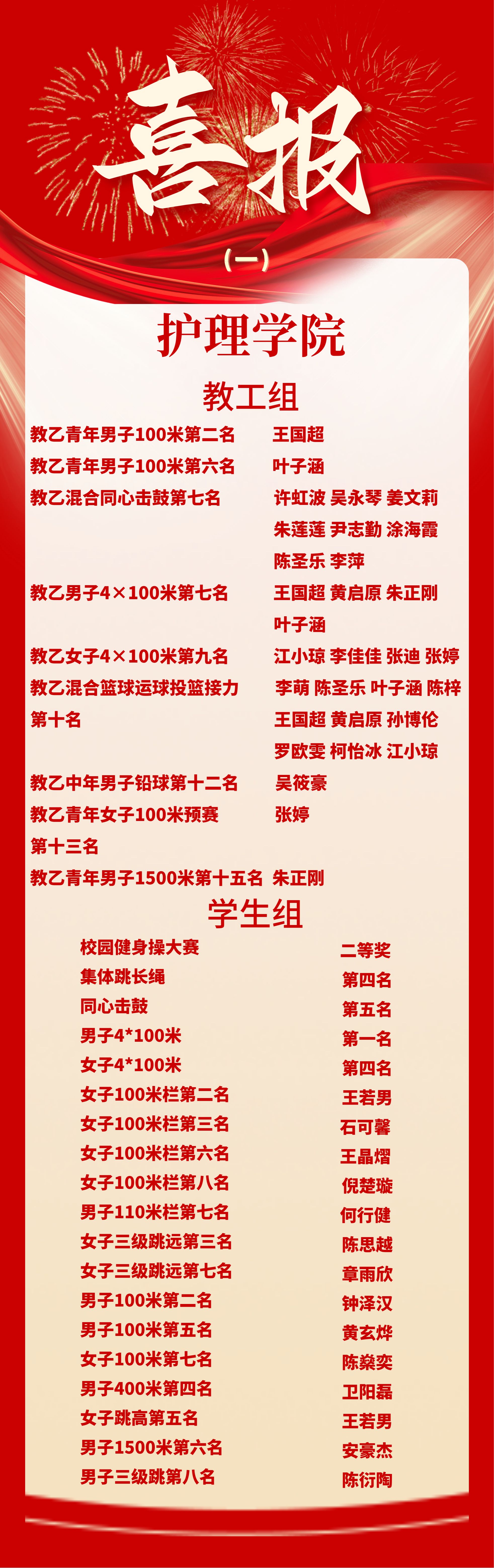 在教乙青年男子100米决赛中,快猫 王国超老师获得第2名、叶子涵老师获得第6名;在教乙青年女子100米预赛中,快猫 张婷老师获得第13名;在教乙青年男子1500米决赛中,快猫 朱正刚老师获得第15名;在教乙男子4×100米决赛中,快猫 教职工王国超、黄启原、朱正刚、叶子涵获得团体第7名;在教乙女子4×100米决赛中,快猫 教职工江小琼、李佳佳、张迪、张婷获得团体第9名。