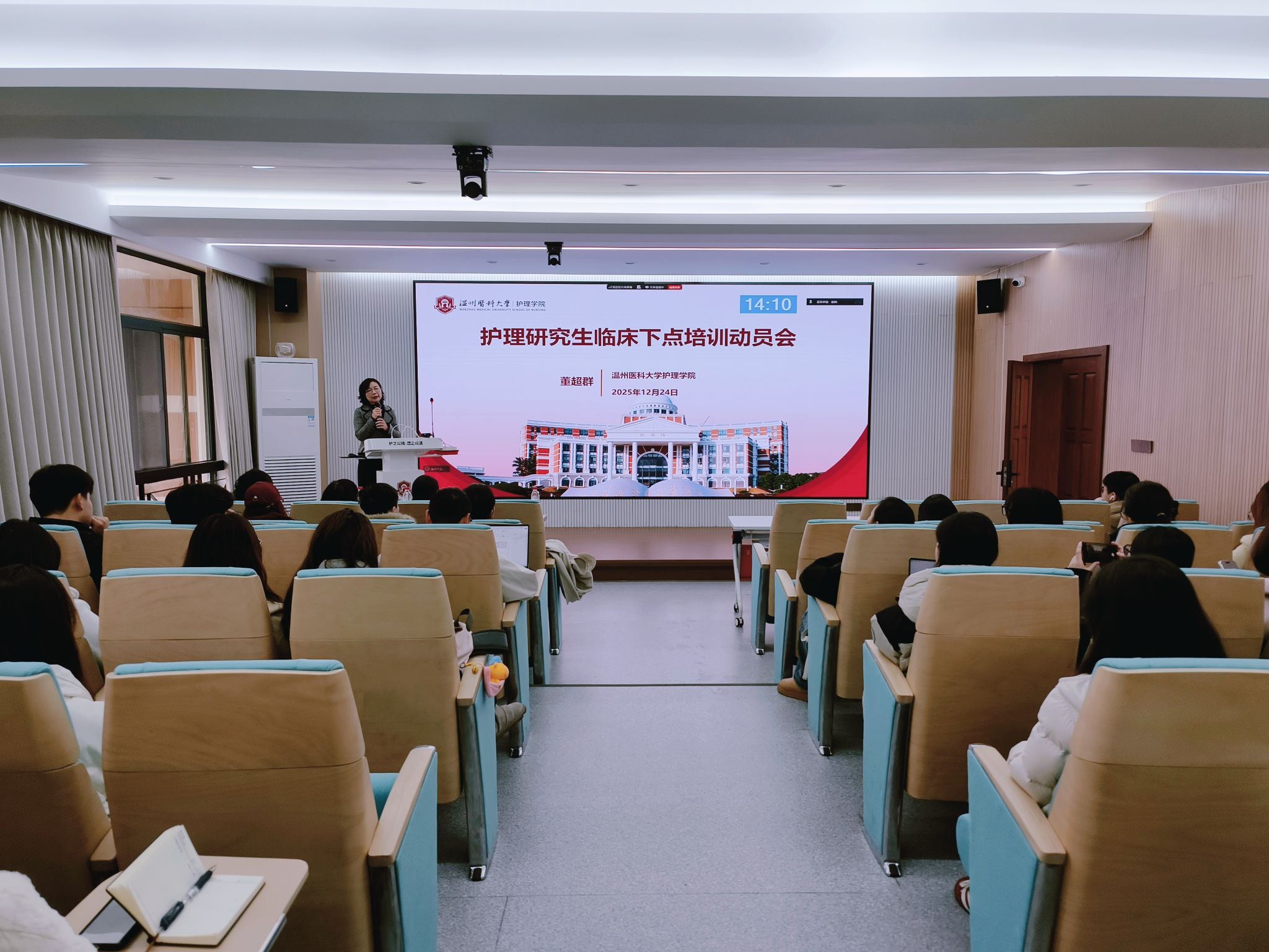 为保障护理研究生人才培养质量,深化临床实践教学环节,引导研究生顺利完成从理论到实践的关键过渡,12月24日上午,快猫 在同仁楼7D203示教室召开了2025级护理研究生临床下点培训动员会。快猫 副院长董超群、附属第一医院护理部副主任陈瑜、附属第二医院护理部副主任诸葛林敏、附属眼视光医院护理部副主任倪灵芝、浙江省台州医院护理部副主任王卫珍、教学办研究生管理老师、辅导员以及2025级全体护理研究生线下参会,各实践基地临床教师代表线上参会,会议由快猫 副院长董超群主持。