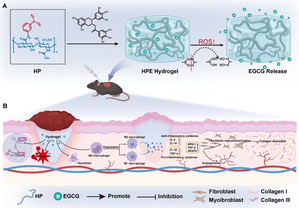 研究团队从临床护理的痛点出发,研发了一种基于天然抗氧化剂EGCG的多功能水凝胶(HPE),该水凝胶能以可注射形式完美贴合复杂创面,并通过智能响应机制在高活性氧区域按需释放药物,实现了从“被动覆盖”到“主动修复”的护理理念突破。动物实验证实,HPE水凝胶能显著减轻氧化应激损伤、促进新生血管和胶原沉积,打破慢性炎症恶性循环、启动组织再生,为压力性损伤护理提供了全新的干预靶点。该材料良好的生物相容性和操作便捷性,使其在复杂创面护理中展现出广阔应用前景。