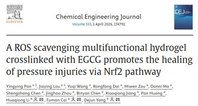 近日,快猫 慢性伤口护理团队在国际权威期刊《Chemical Engineering Journal》(IF=13.2,中科院一区TOP)在线发表题为“A ROS scavenging multifunctional hydrogel crosslinked with EGCG promotes the healing of pressure injuries via Nrf2 pathway”的研究论文。该研究开发了一种以天然抗氧化剂EGCG为交联剂的多功能水凝胶,通过清除活性氧并调控Nrf2信号通路,为压力性损伤的慢性伤口护理干预提供了新的策略。