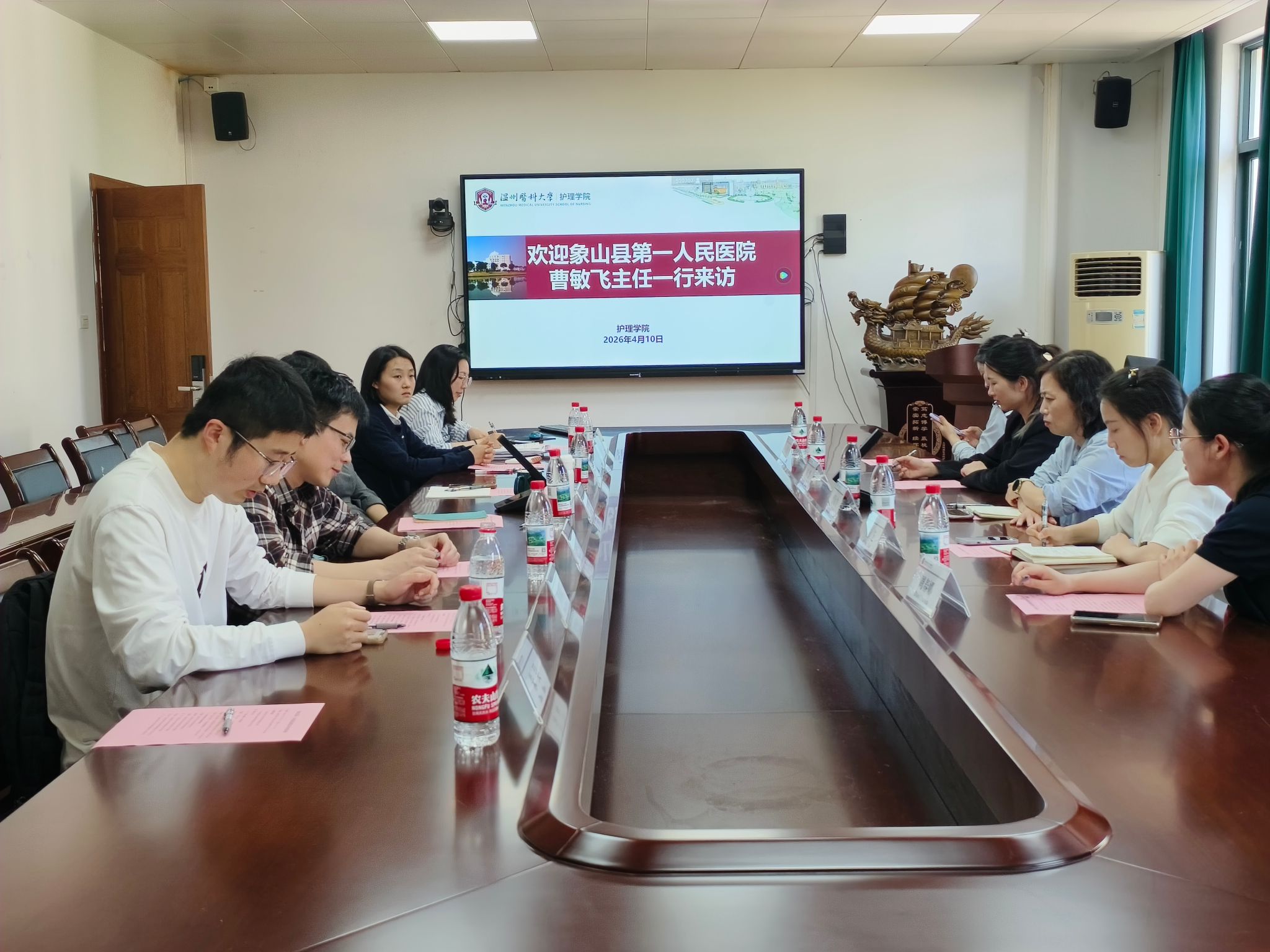 2026年4月10日下午,象山县第一人民医院护理管理中心主任曹敏飞一行来院访问交流。快猫 院长蔡福满、副院长董超群、专任教师代表及教学办公室相关老师参会,双方围绕学院建设、学科发展与科研创新等核心内容深入研讨。