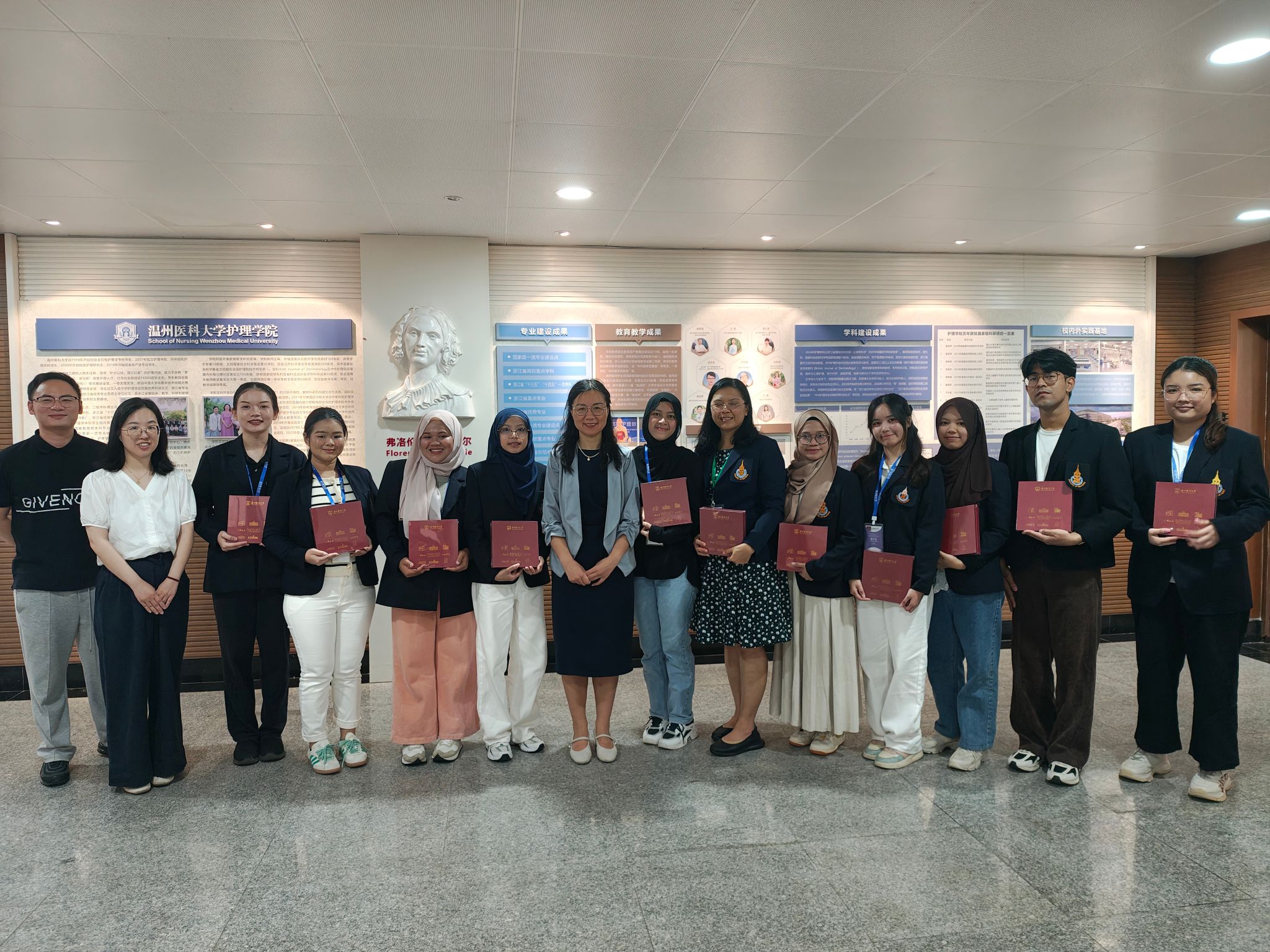 两批代表团分别由宋卡王子大学Kesorn Promlek教授与Pimpisa Saksorngmuang教授带队,包括20名护理专业学生组成。本次学术交流围绕“学术交流-临床见习-文化体验”三大主线展开活动。学术交流方面,代表团参观快猫 校史馆、人体科学馆及护理实验室,并围绕实验教学创新与实验室师生展开专题研讨。临床实践方面,代表团赴快猫 附属医院参访交流。附属第一医院梁世耀护士长,附属第二医院、育英儿童医院张春梅副院长,附属康宁医院吴春华主任,茶山街道卫生院贾建新院长等率护理团队热情接待代表团。各附属医院结合自身特色展示护理专业优势,并表达了与泰国宋卡王子大学深化合作,系统推进教育资源共享、学术成果共育与医疗技术互通的意愿。文化体验方面,在快猫 教师和志愿者陪同下,代表团游览五马街历史文化街区,感受温州传统商业文化与南戏文化。