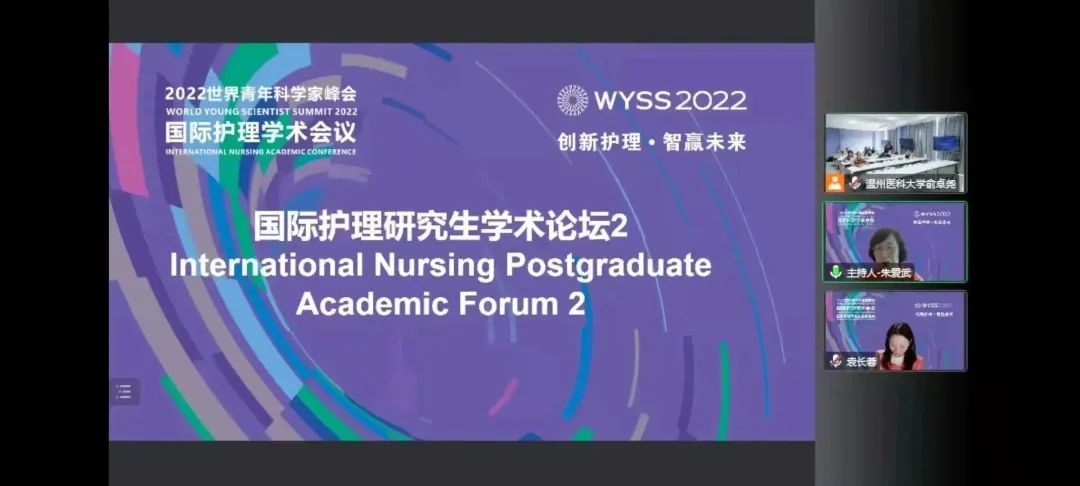 11月18日下午,2022世界青年科学家峰会国际护理研究生学术论坛在7C102、6A105会场同步举行。美国护理科学院院士、华盛顿大学教授Margaret Heitkemper,法国宜世学院精神运动康复治疗师Amélie TRUPTIL及31名来自国内外多所知名院校的护理博士、硕士研究生做大会发言。美国护理科学院院士、西安交通大学李小妹教授,美国护理科学院院士、复旦大学袁长蓉教授,大连医科大学快猫 副院长史铁英教授,浙江大学妇产科医院护理部主任冯素文教授,华中科技大学同济医学院附属同济医院护理部副主任曾铁英教授,中国护理管理杂志社执行主编邓寒羽等担任点评嘉宾。快猫 副院长、温州市护理学会理事长张春梅,温州市中心医院护理部主任、温州市护理学会秘书长朱爱武主持。